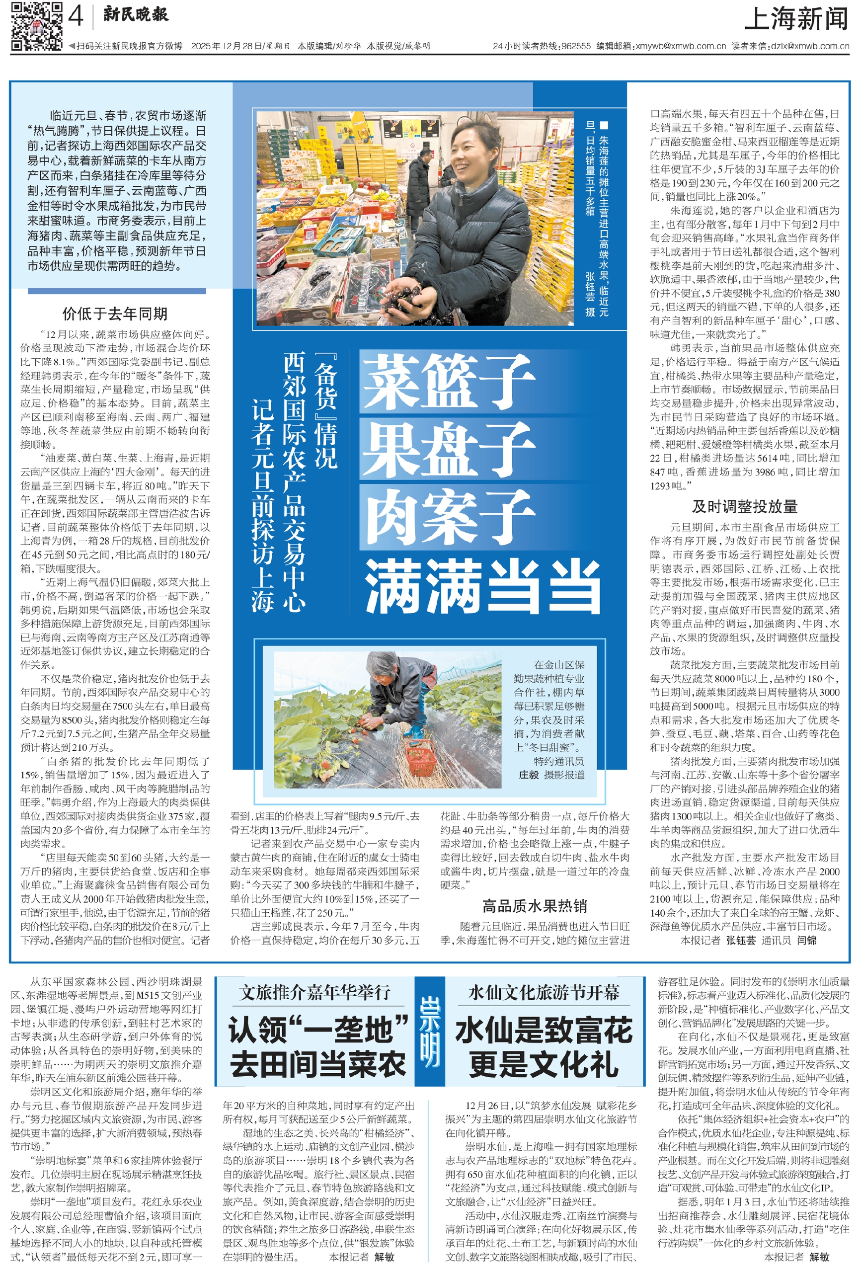 临近元旦、春节,农贸市场逐渐“热气腾腾”,节日保供提上议程。日前,记者探访上海西郊国际农产品交易中心,载着新鲜蔬菜的卡车从南方产区而来,白条猪挂在冷库里等待分割,还有智利车厘子、云南蓝莓、广西金柑等时令水果成箱批发,为市民带来甜蜜味道。市商务委表示,目前上海猪肉、蔬菜等主副食品供应充足,品种丰富,价格平稳,预测新年节日市场供应呈现供需两旺的趋势。