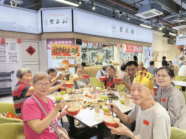 国庆节时,老人们到康乐汇社区长者食堂吃面,欢度节日 资料图