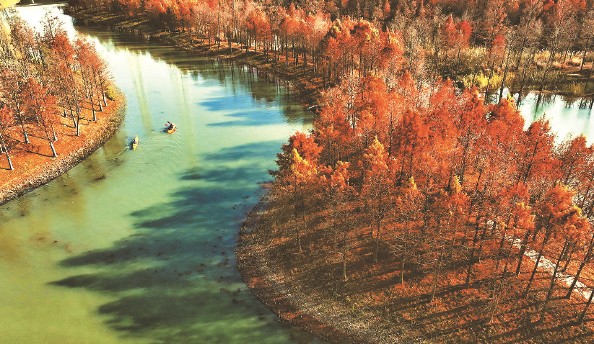 1 初冬时节,浦东三林滨江城市“水森林”迎来了层林尽染的醉美景色,3500余株杉树相继染红,与河湾里穿梭的皮划艇相映成趣,宛若一幅写实版的森林油画。