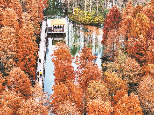 2 连日来,上海青西郊野公园“水森林”呈现出一年中最美颜值。被称作“活化石植物”的池杉林全面浸染为绚丽的朱红色、赭红色与深棕色,一株株杉树与倒影涟漪交织,就像打翻了的调色盘浸在水里,宛如一幅醉人的美拉德限定油画,吸引不少市民游客来这里打卡赏景。 杨建正 张锡峰 摄影报道