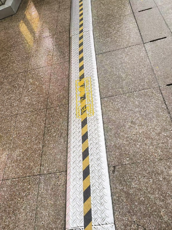 报道刊发后,记者回访现场看到,在陆家嘴环形天桥靠近正大广场的这侧,事发的铝条上已经张贴了类似贴纸的条纹状警示条,该警示条长条窄形,沿铝条走向,贯穿整条铝条。原先雨天有点湿滑的铝合金表面,现在不管脚踩还是触摸,都能感受到极大的摩擦效果,防滑效果提升明显。此时天有小雨,铝条上还“跨立”着“小心地滑”的安全警示标识牌。