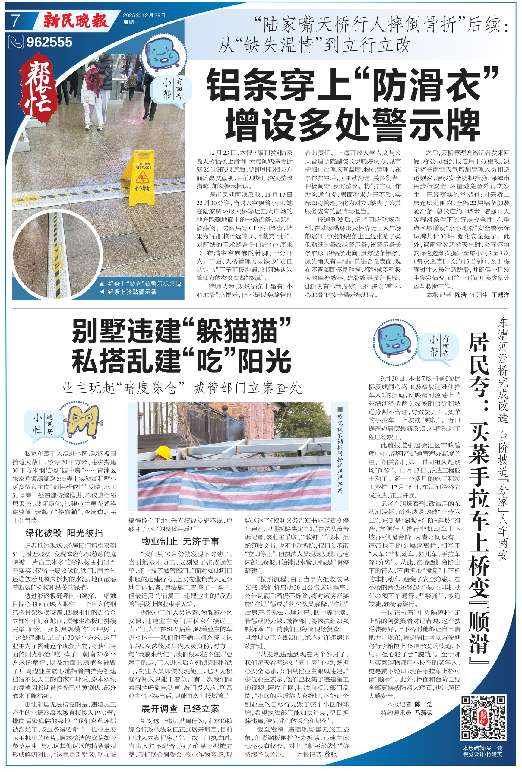 12月23日,本报7版刊发《陆家嘴天桥铝条上滑倒 六旬阿姨摔骨折缝26针》的报道后,随即引起相关方面的高度重视,目前现场已落实整改措施,加设警示标识。