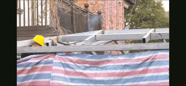 透过彩钢板缝隙向内窥探,一幅触目惊心的画面映入眼帘:一个巨大的钢结构骨架纵横交错,四根粗壮的铝合金立柱牢牢钉在地面,顶部生态板已拼接完毕,俨然一座初具规模的“园中房”。“这处违建足足占了30多平方米,这户业主为了搭建这个庞然大物,将我们南面的阳光都给‘吃’掉了!朝南20多平方米的草坪,以及地面的绿植全被毁了!”周边业主痛心地指着围挡旁被遮挡得不见天日的自家草坪说,原本翠绿的绿植因长期被挡光已枯黄倒伏,部分灌木干脆枯死。