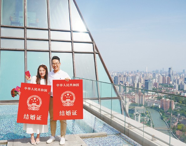 5月19日,位于上海环球港52楼观景平台的全市最高户外婚姻登记点正式启用。通过前期开放预约,当天共有8对新人赶来“尝鲜”,感受258米高空的浪漫,在云端登记、见证属于自己的幸福 本报记者 张龙 摄