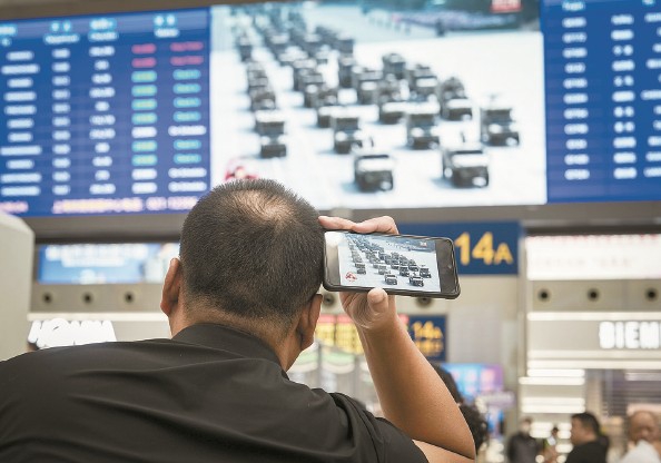 9月3日,在虹桥火车站候车区,车站大屏正在转播中国人民抗日战争暨世界反法西斯战争胜利80周年阅兵式,一位旅客一边观看大屏,一边通过手机收听解说 本报记者 陈梦泽 摄