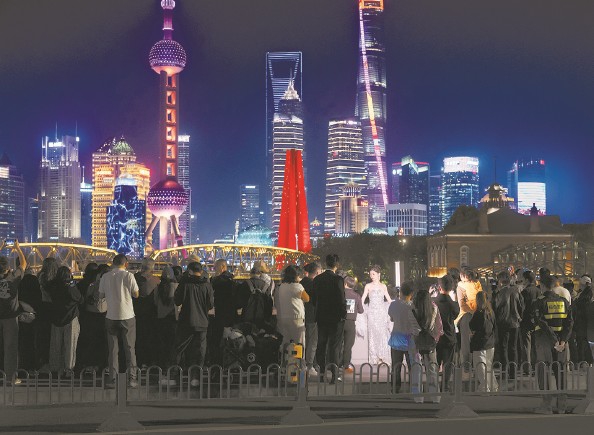4月20日,乍浦路桥上,一名女子在拍摄婚纱时尚片,身后的陆家嘴建筑群华灯璀璨,将上海这座时尚之都的摩登光影与都市魅力定格于镜头之间 本报记者 周馨 摄