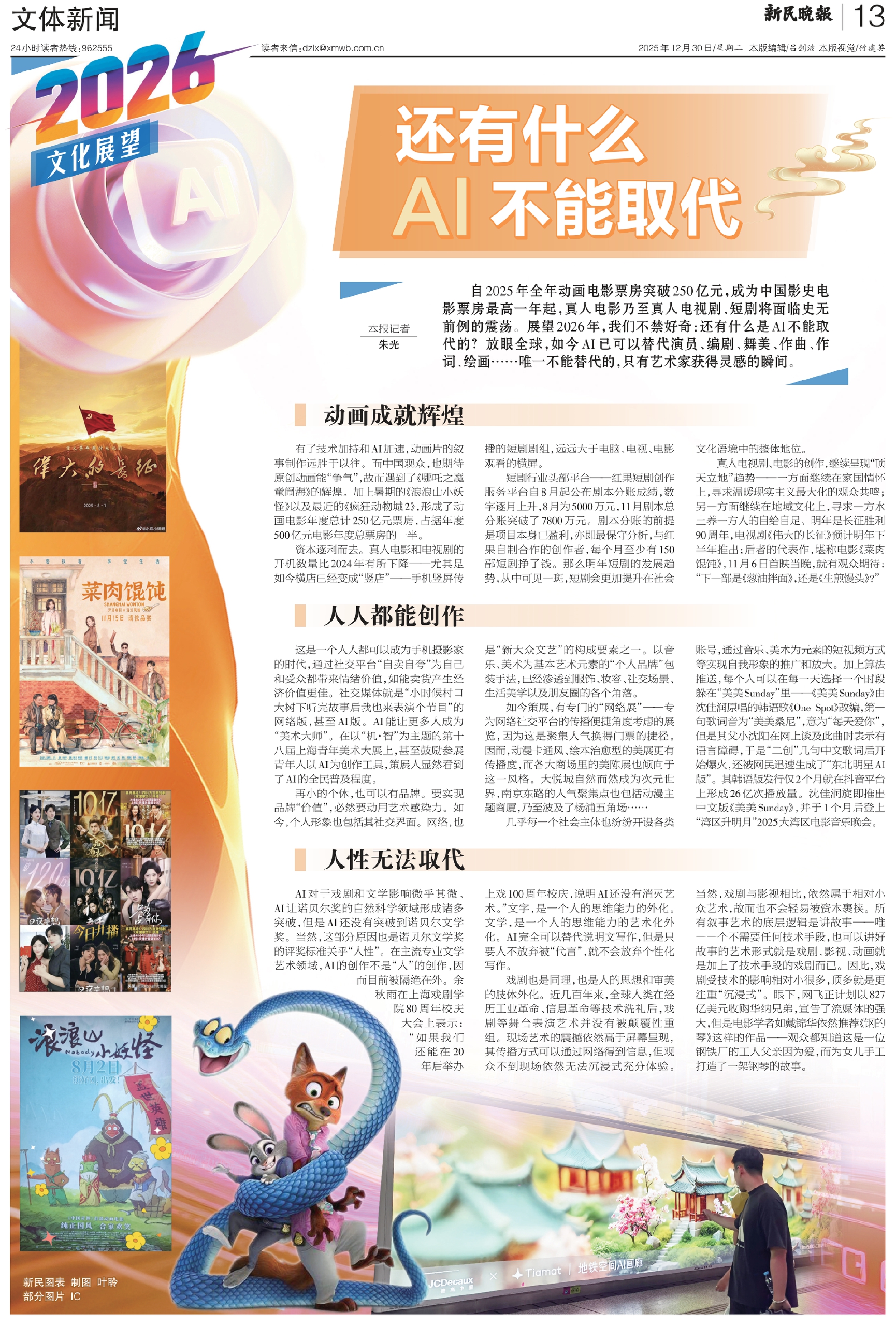 自2025年全年动画电影票房突破250亿元,成为中国影史电影票房最高一年起,真人电影乃至真人电视剧、短剧将面临史无前例的震荡。展望2026年,我们不禁好奇:还有什么是AI不能取代的?放眼全球,如今AI已可以替代演员、编剧、舞美、作曲、作词、绘画……唯一不能替代的,只有艺术家获得灵感的瞬间。