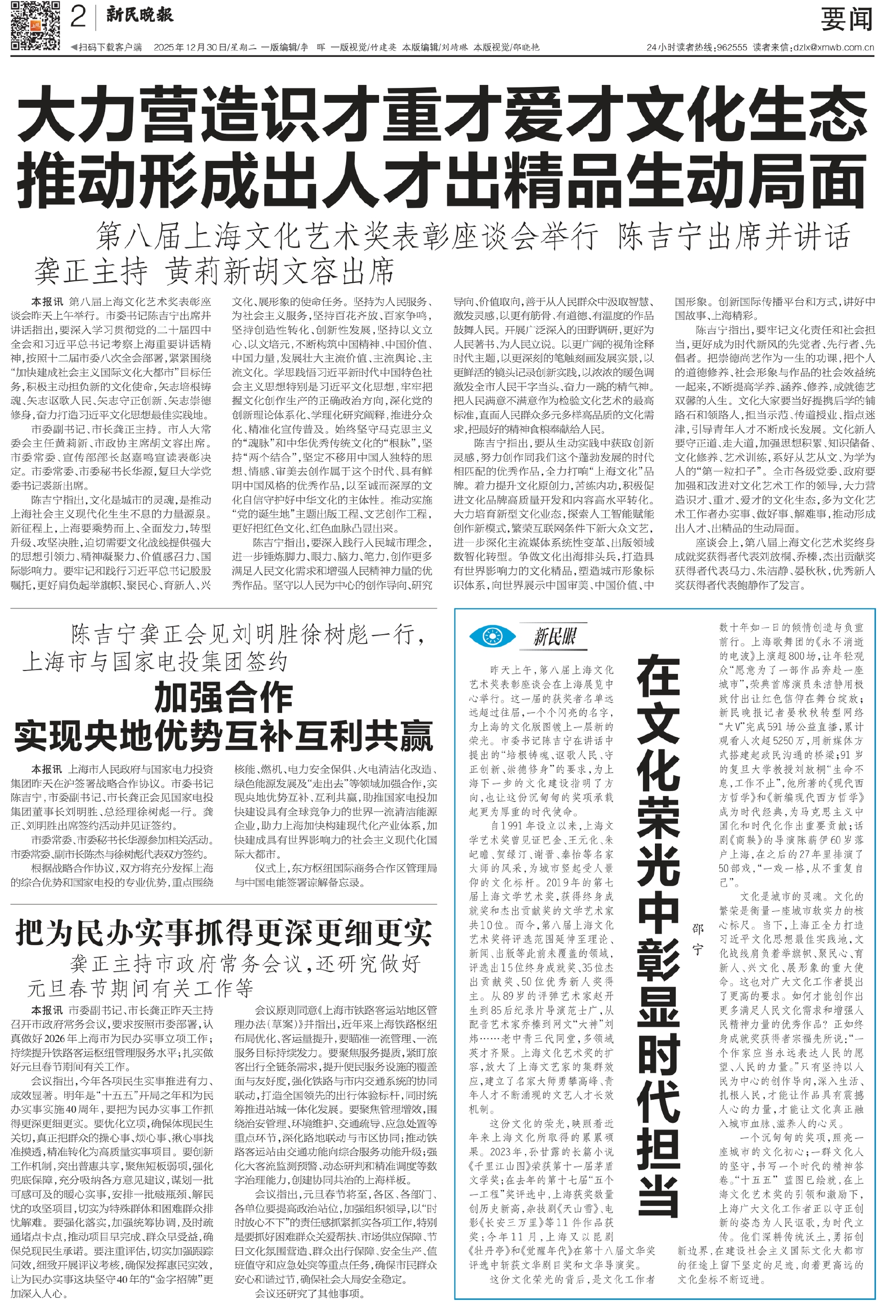 陈吉宁指出,要从生动实践中获取创新灵感,努力创作同我们这个蓬勃发展的时代相匹配的优秀作品,全力打响“上海文化”品牌。着力提升文化原创力,苦练内功,积极促进文化品牌高质量开发和内容高水平转化。大力培育新型文化业态,探索人工智能赋能创作新模式,繁荣互联网条件下新大众文艺,进一步深化主流媒体系统性变革、出版领域数智化转型。争做文化出海排头兵,打造具有世界影响力的文化精品,塑造城市形象标识体系,向世界展示中国审美、中国价值、中国形象。创新国际传播平台和方式,讲好中国故事、上海精彩。