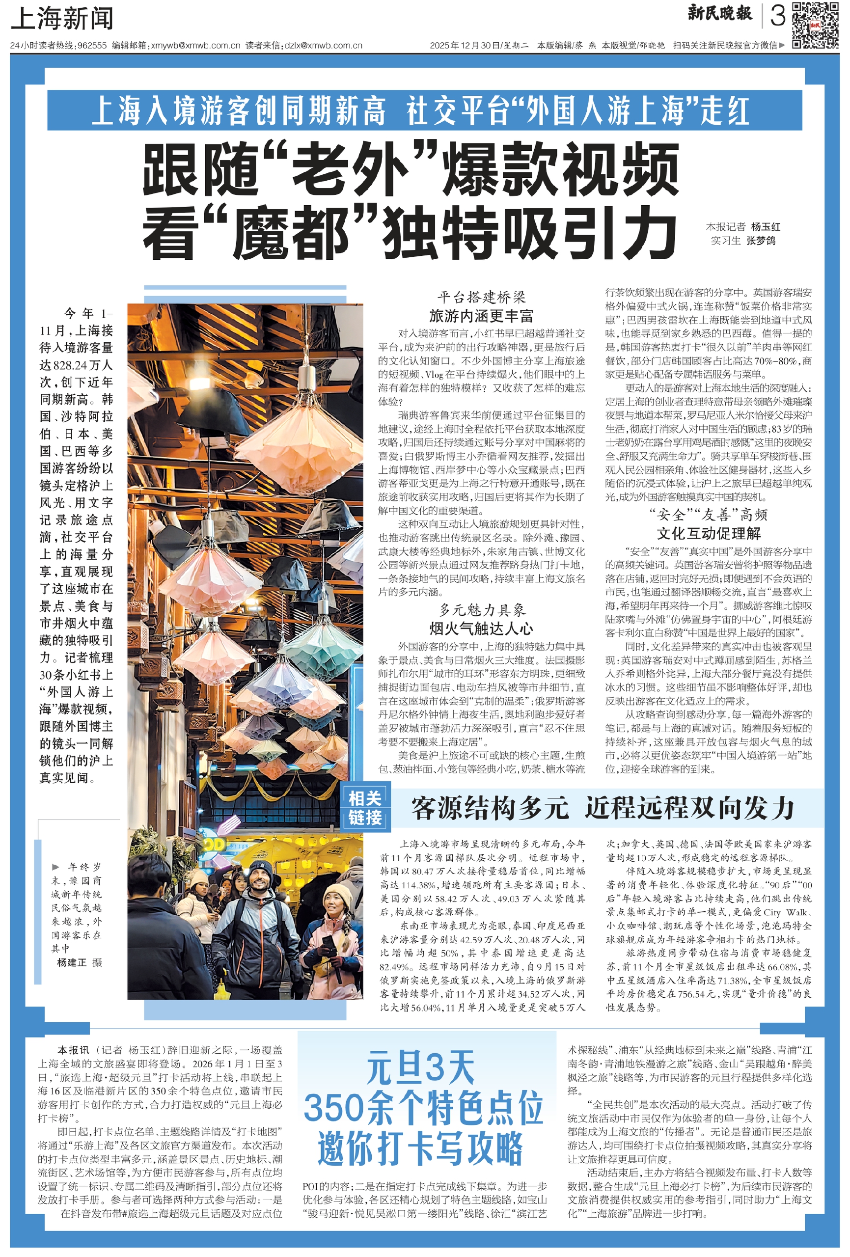 今年1-11月,上海接待入境游客量达828.24万人次,创下近年同期新高。韩国、沙特阿拉伯、日本、美国、巴西等多国游客纷纷以镜头定格沪上风光、用文字记录旅途点滴,社交平台上的海量分享,直观展现了这座城市在景点、美食与市井烟火中蕴藏的独特吸引力。记者梳理30条小红书上“外国人游上海”爆款视频,跟随外国博主的镜头一同解锁他们的沪上真实见闻。