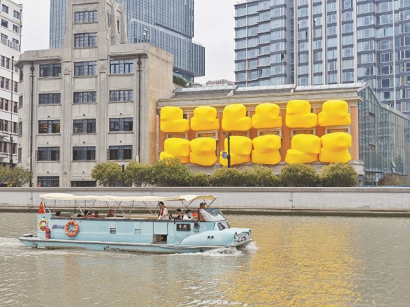 静安苏河皓司原为建于1931年的中国实业银行货栈。沿河外墙上的黄色充气艺术装置,从窗口挤出,仿佛货物“爆仓”