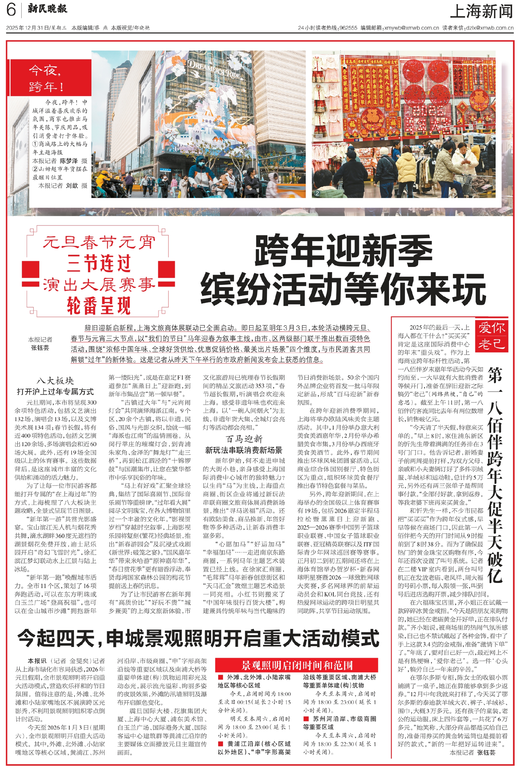 辞旧迎新启新程,上海文旅商体展联动已全面启动。即日起至明年3月3日,本轮活动横跨元旦、春节与元宵三大节点,以“我们的节日”马年迎春为叙事主线,由市、区两级部门联手推出数百项特色活动,围绕“浓郁中国年味、全球好货供给、优惠促销价格、最美出片场景”四个维度,与市民游客共同解锁“过年”的新体验。这是记者从昨天下午举行的市政府新闻发布会上获悉的信息。