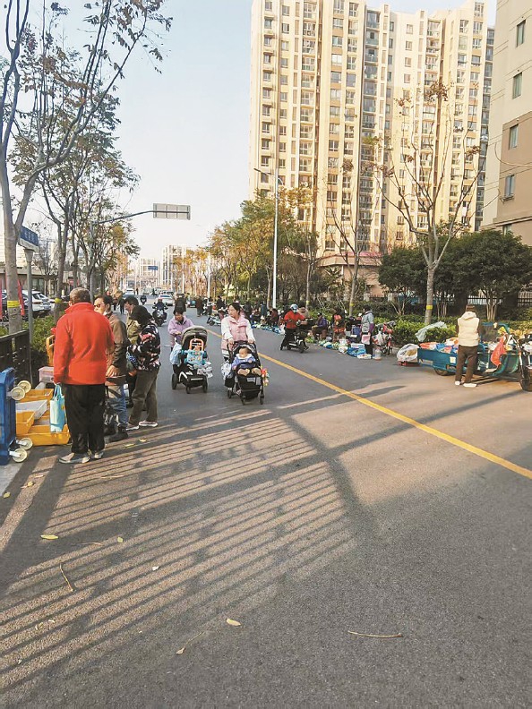 不少摊贩在小区附近占道摆摊卖菜 受访者供图