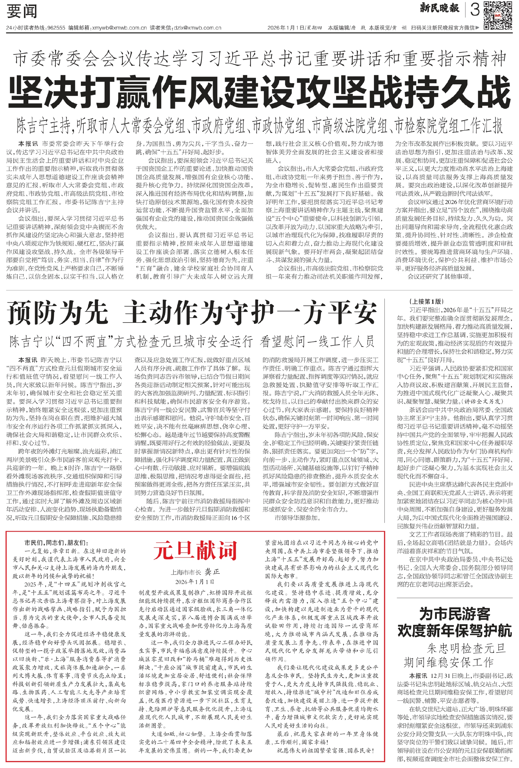 会议指出,市人大常委会党组、市政府党组、市政协党组一年来勇于担当、善于作为,为全市稳增长、促转型、惠民生作出重要贡献,为谋划“十五五”发展打下良好基础。做好明年工作,要把贯彻落实习近平总书记考察上海重要讲话精神作为主题主线,聚焦建设“五个中心”重要使命,以科技创新为引领,以改革开放为动力,以国家重大战略为牵引,以城市治理现代化为保障,找准履职尽责的切入点和着力点,奋力推动上海现代化建设展现新气象。要开好市两会,凝聚起团结奋斗、共谋发展的强大力量。