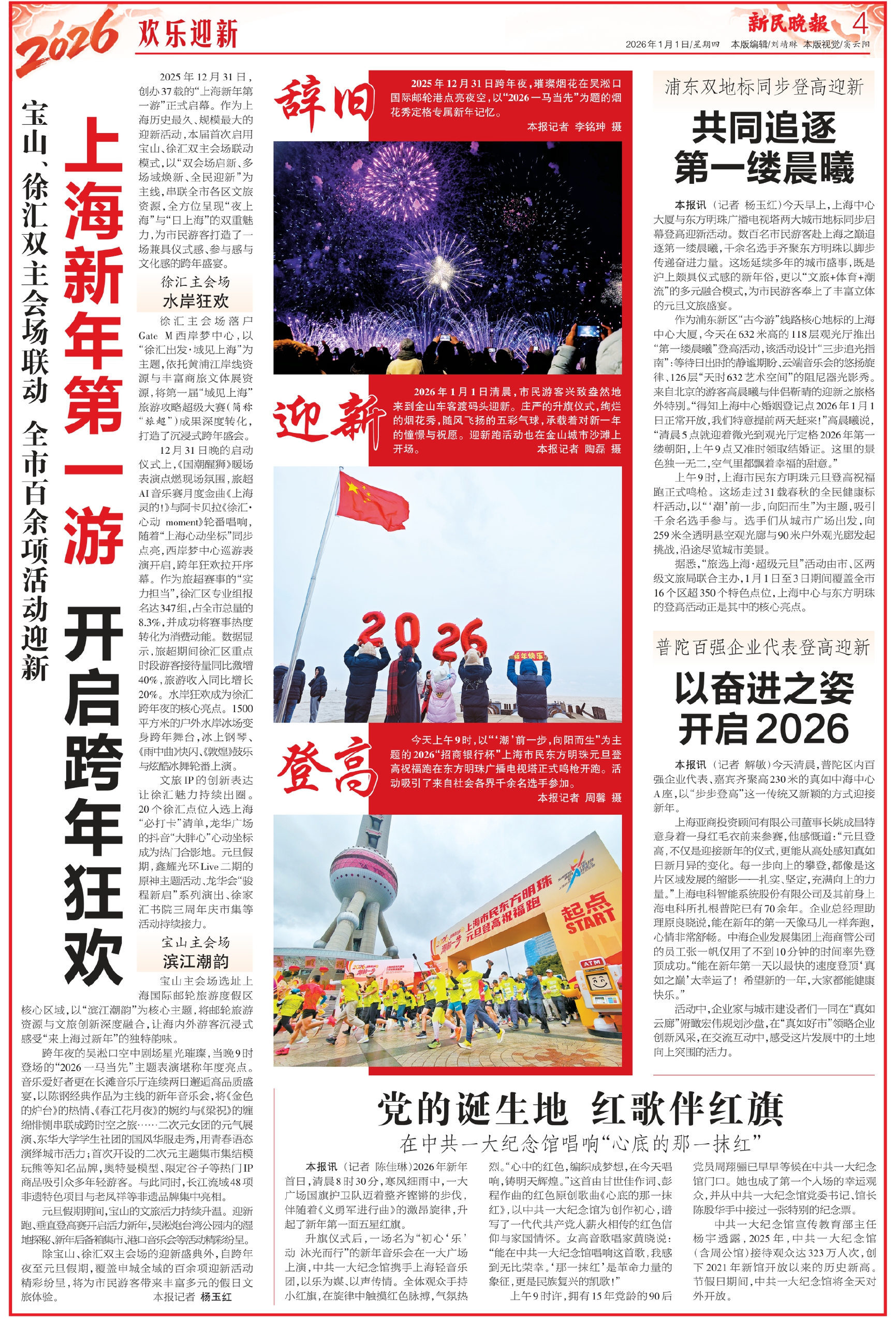 除宝山、徐汇双主会场的迎新盛典外,自跨年夜至元旦假期,覆盖申城全域的百余项迎新活动精彩纷呈,将为市民游客带来丰富多元的假日文旅体验。 本报记者 杨玉红