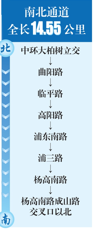 南北通道以上下叠层形式的地道大路为主,建设规模为双向4车道+两侧集散车道,设计速度为60公里/小时,为小客车专用城市主干路。出入口匝道共9处,分别为邯郸路进出口匝道、四平路出口匝道、周家嘴路进出口匝道、海拉尔路进口/临平路出口匝道、浦东大道进出口匝道、张杨路进口匝道、龙阳路进出口匝道、浦三路进出口匝道、成山路进出口匝道。(下转第2版)(上接第1版)