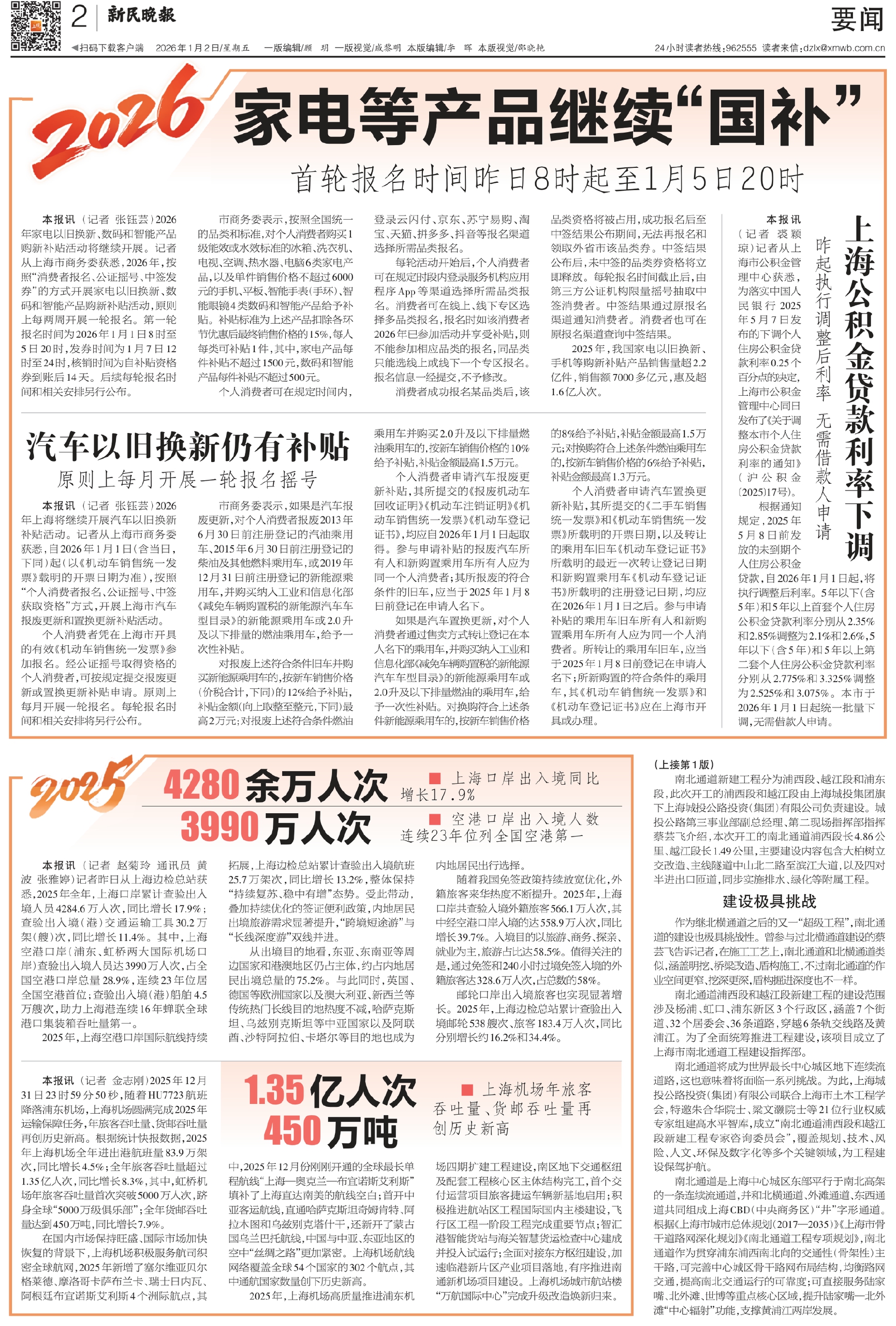 本报讯(记者 张钰芸)2026年家电以旧换新、数码和智能产品购新补贴活动将继续开展。记者从上海市商务委获悉,2026年,按照“消费者报名、公证摇号、中签发券”的方式开展家电以旧换新、数码和智能产品购新补贴活动,原则上每两周开展一轮报名。第一轮报名时间为2026年1月1日8时至5日20时,发券时间为1月7日12时至24时,核销时间为自补贴资格券到账后14天。后续每轮报名时间和相关安排另行公布。