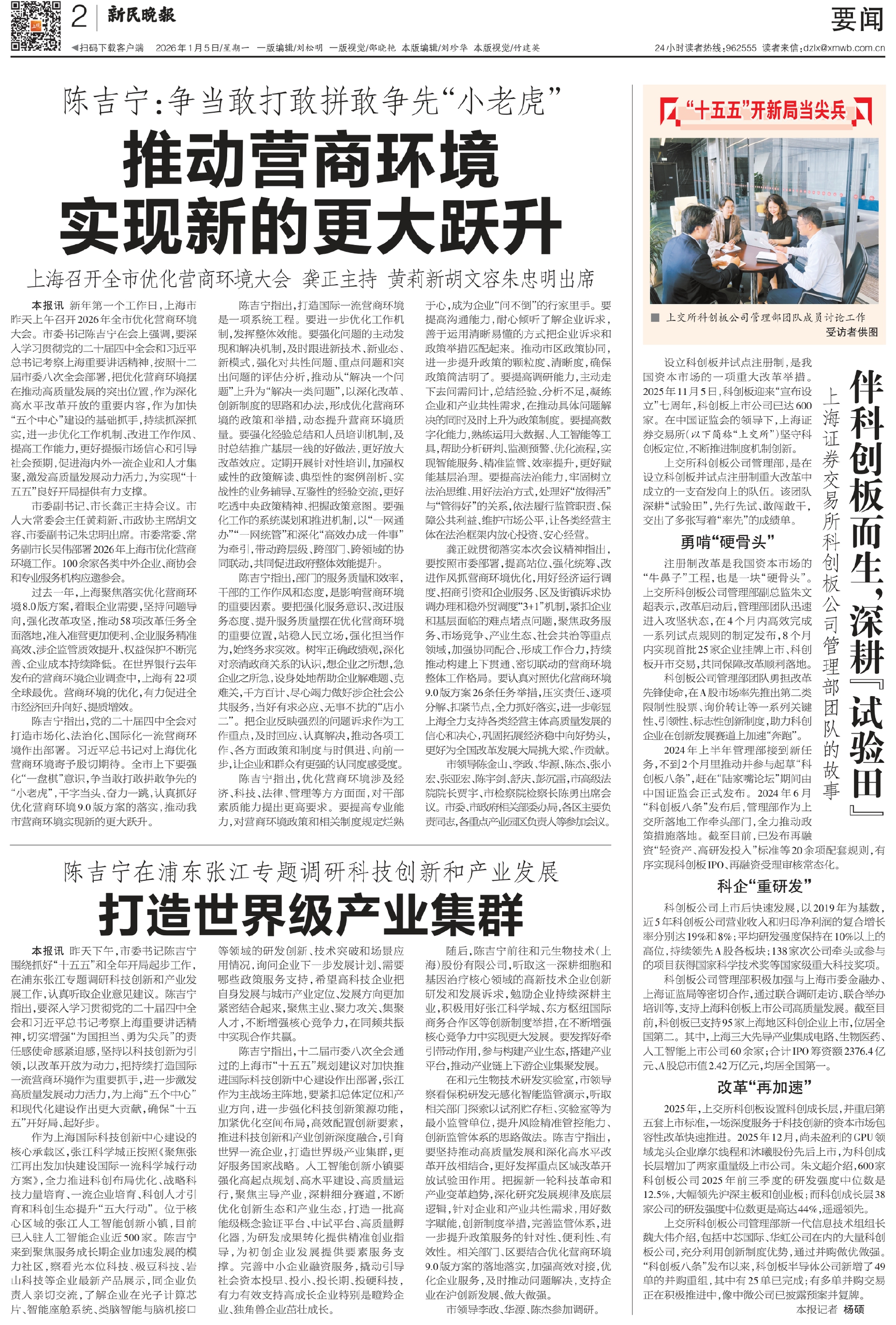 本报讯 新年第一个工作日,上海市昨天上午召开2026年全市优化营商环境大会。市委书记陈吉宁在会上强调,要深入学习贯彻党的二十届四中全会和习近平总书记考察上海重要讲话精神,按照十二届市委八次全会部署,把优化营商环境摆在推动高质量发展的突出位置,作为深化高水平改革开放的重要内容,作为加快“五个中心”建设的基础抓手,持续抓深抓实,进一步优化工作机制、改进工作作风、提高工作能力,更好提振市场信心和引导社会预期,促进海内外一流企业和人才集聚,激发高质量发展动力活力,为实现“十五五”良好开局提供有力支撑。