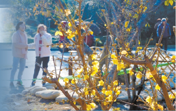 真如公园内第一拨蜡梅已绽放枝头,吸引不少市民前来赏梅拍照 杨建正 摄