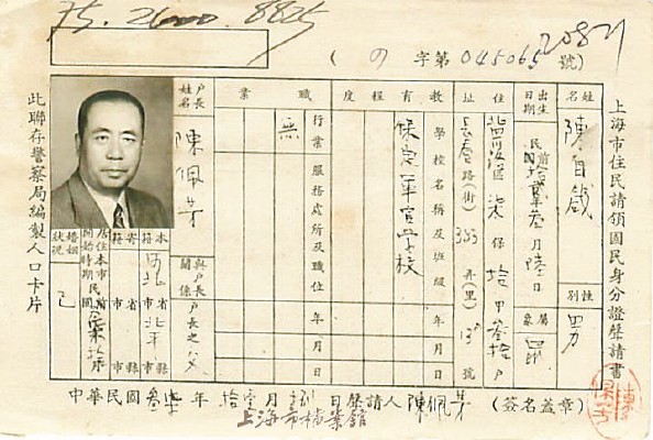 上海市住民请领国民身分(份)证声请书——陈自箴(陈宝仓)(右上图)
