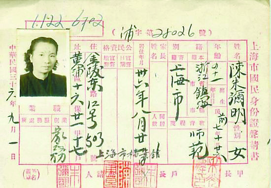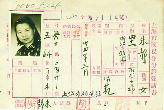 上海市国民身份证声请书——朱枫化名朱静、陈朱弥明(右中、右下图)