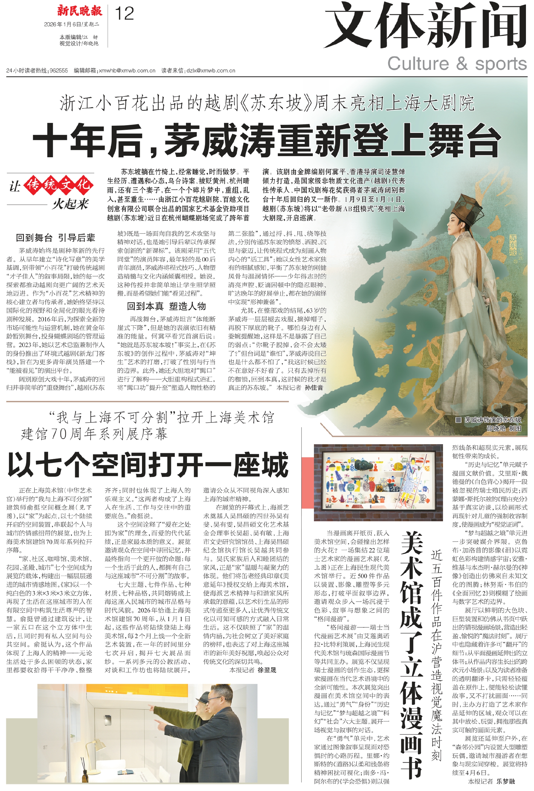 苏东坡躺在竹椅上,经常睡觉,时而做梦。平生经历、遭遇和心态,乌台诗案、被贬黄州、杭州晴雨,还有三个妻子,在一个个碎片梦中,重组,乱入,甚至重生……由浙江小百花越剧院、百越文化创意有限公司联合出品的国家艺术基金资助项目越剧《苏东坡》近日在杭州蝴蝶剧场完成了跨年首演。该剧由金牌编剧何冀平、香港导演司徒慧焯倾力打造,是国家级非物质文化遗产(越剧)代表性传承人、中国戏剧梅花奖获得者茅威涛阔别舞台十年后回归的又一新作。1月9日至1月11日,越剧《苏东坡》将以“老带新AB组模式”亮相上海大剧院,开启巡演。