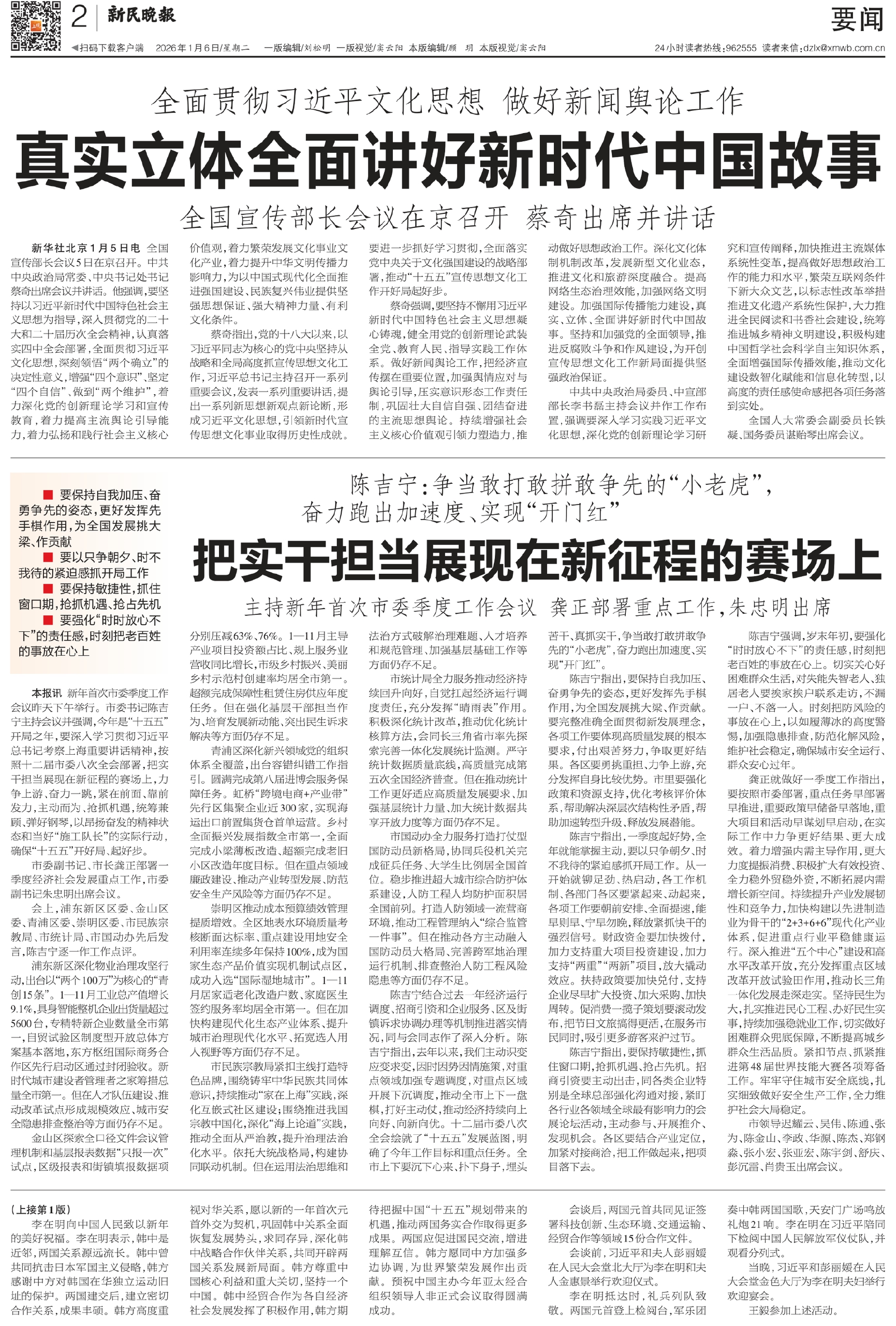 蔡奇指出,党的十八大以来,以习近平同志为核心的党中央坚持从战略和全局高度抓宣传思想文化工作,习近平总书记主持召开一系列重要会议,发表一系列重要讲话,提出一系列新思想新观点新论断,形成习近平文化思想,引领新时代宣传思想文化事业取得历史性成就。要进一步抓好学习贯彻,全面落实党中央关于文化强国建设的战略部署,推动“十五五”宣传思想文化工作开好局起好步。