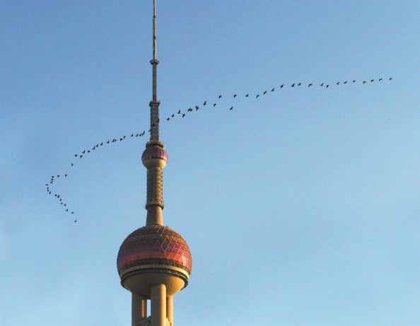 申城进入候鸟迁徙高峰期。近日,一批抵沪越冬的候鸟编队翱翔于魔都天际。它们串联成一条壮观的“鸟带”,飞经东方明珠塔上空,生动再现了申城生态与城市景观交融之美。 杨建正 摄影报道