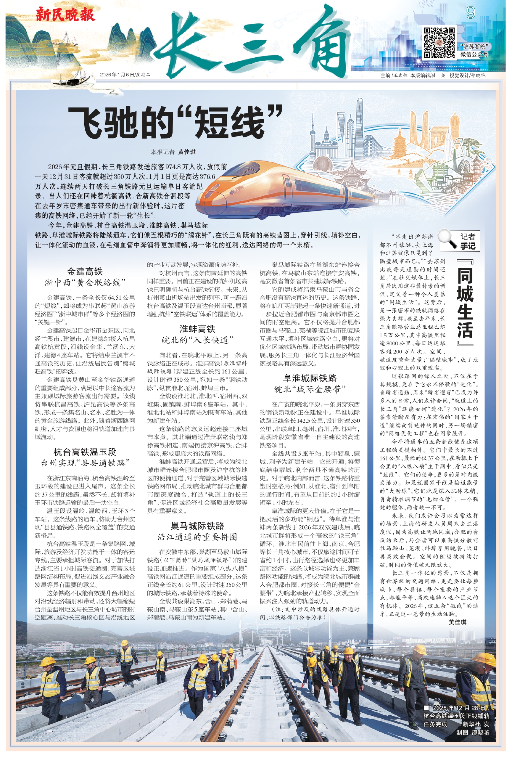 2026年元旦假期,长三角铁路发送旅客974.8万人次,放假前一天12月31日客流就超过350万人次,1月1日更是高达376.6万人次,连续两天打破长三角铁路元旦运输单日客流纪录。当人们还在回味着杭衢高铁、合新高铁合泗段等在去年岁末密集通车带来的出行新体验时,这片密集的高铁网络,已经开始了新一轮“生长”。
