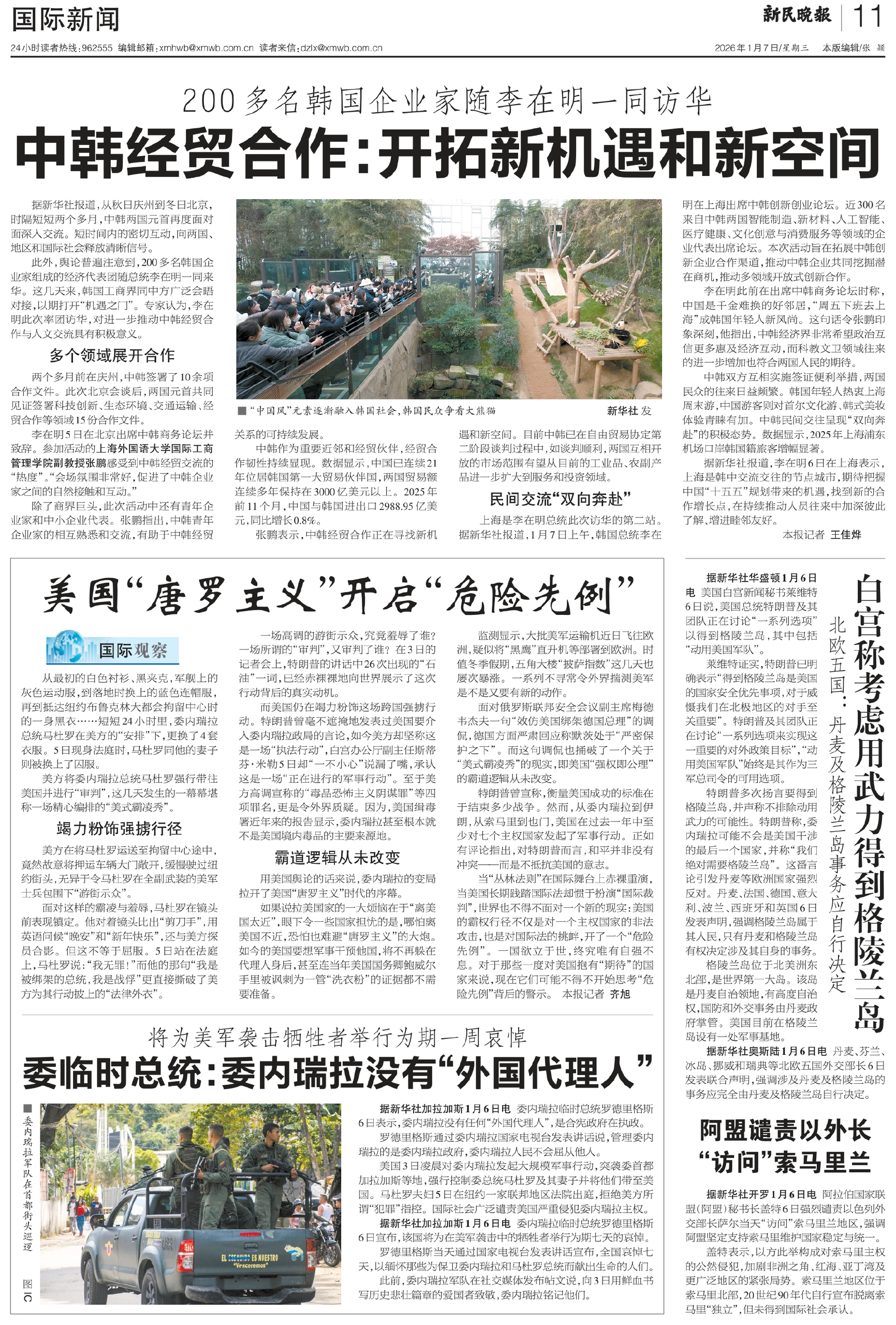 此外,舆论普遍注意到,200多名韩国企业家组成的经济代表团随总统李在明一同来华。这几天来,韩国工商界同中方广泛会晤对接,以期打开“机遇之门”。专家认为,李在明此次率团访华,对进一步推动中韩经贸合作与人文交流具有积极意义。