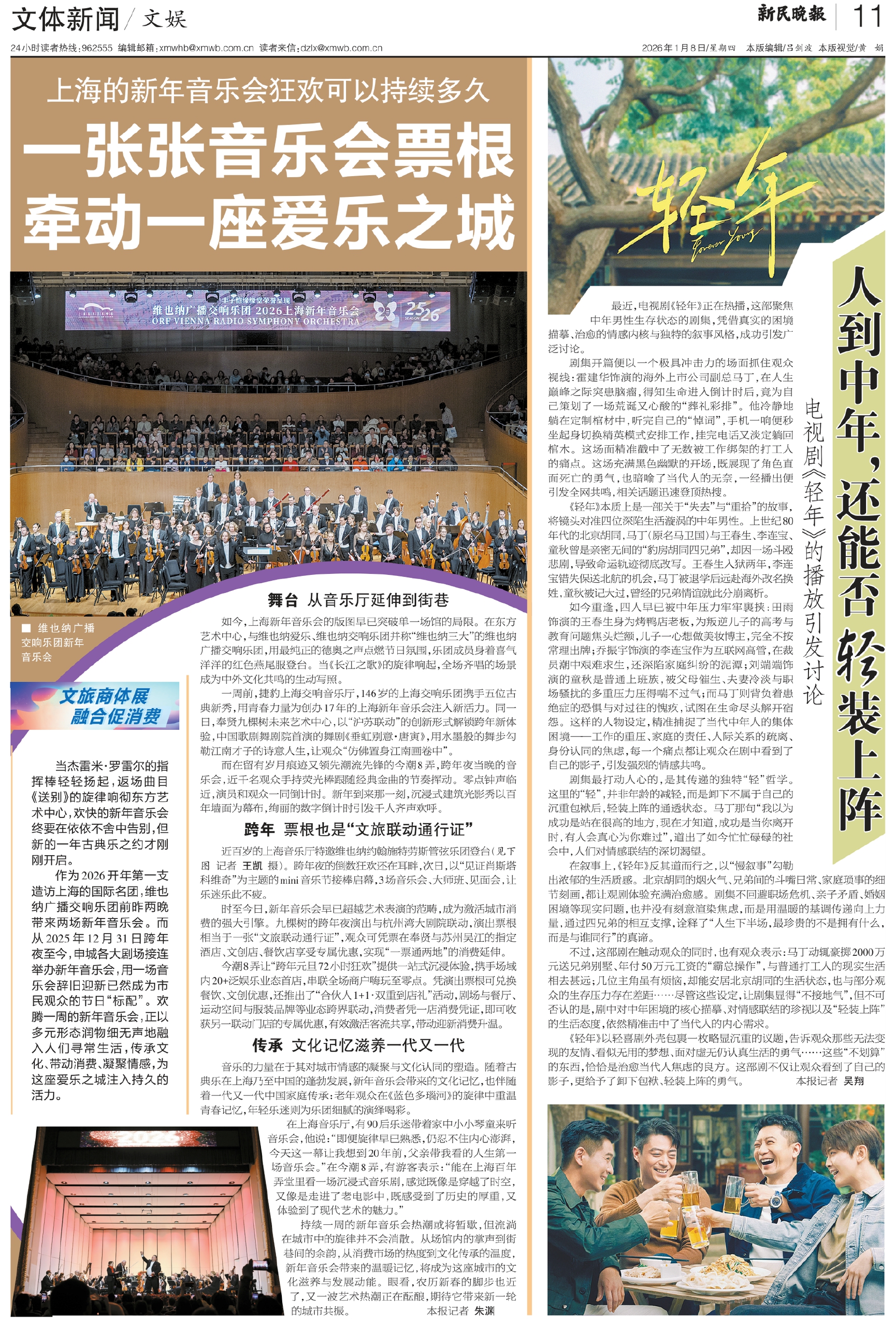 作为2026开年第一支造访上海的国际名团,维也纳广播交响乐团前昨两晚带来两场新年音乐会。而从2025年12月31日跨年夜至今,申城各大剧场接连举办新年音乐会,用一场音乐会辞旧迎新已然成为市民观众的节日“标配”。欢腾一周的新年音乐会,正以多元形态润物细无声地融入人们寻常生活,传承文化、带动消费、凝聚情感,为这座爱乐之城注入持久的活力。