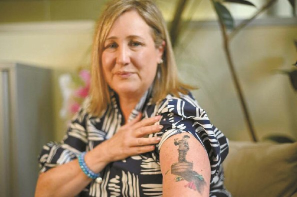 米娅·班尼斯特展示手臂上纪念儿子奥利的刺青