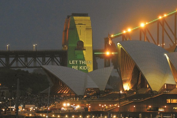 禁令生效当天,悉尼海港大桥上投射着“让他们做孩子”的标语
