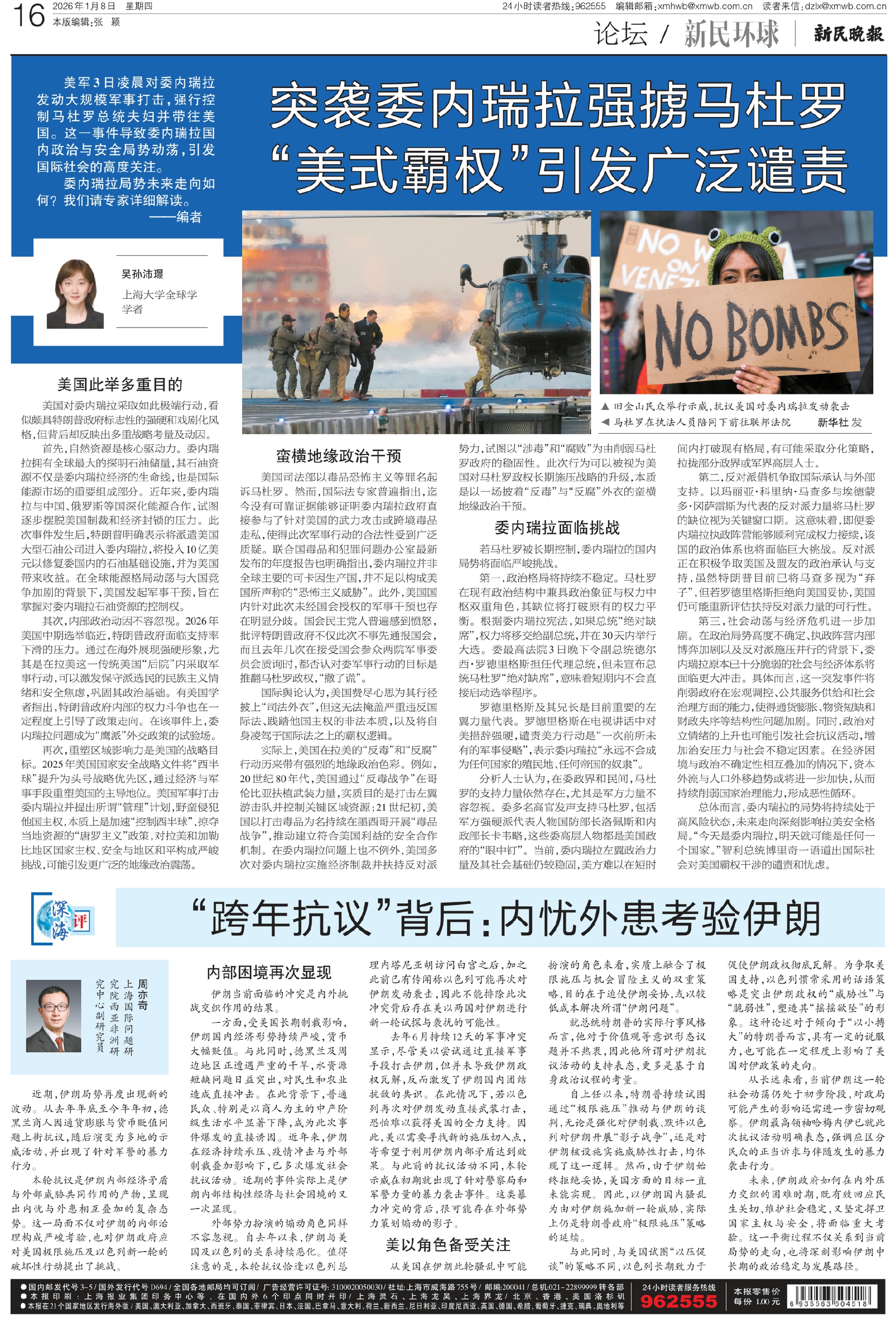 再次,重塑区域影响力是美国的战略目标。2025年美国国家安全战略文件将“西半球”提升为头号战略优先区,通过经济与军事手段重塑美国的主导地位。美国军事打击委内瑞拉并提出所谓“管理”计划,野蛮侵犯他国主权,本质上是加速“控制西半球”、掠夺当地资源的“唐罗主义”政策,对拉美和加勒比地区国家主权、安全与地区和平构成严峻挑战,可能引发更广泛的地缘政治震荡。