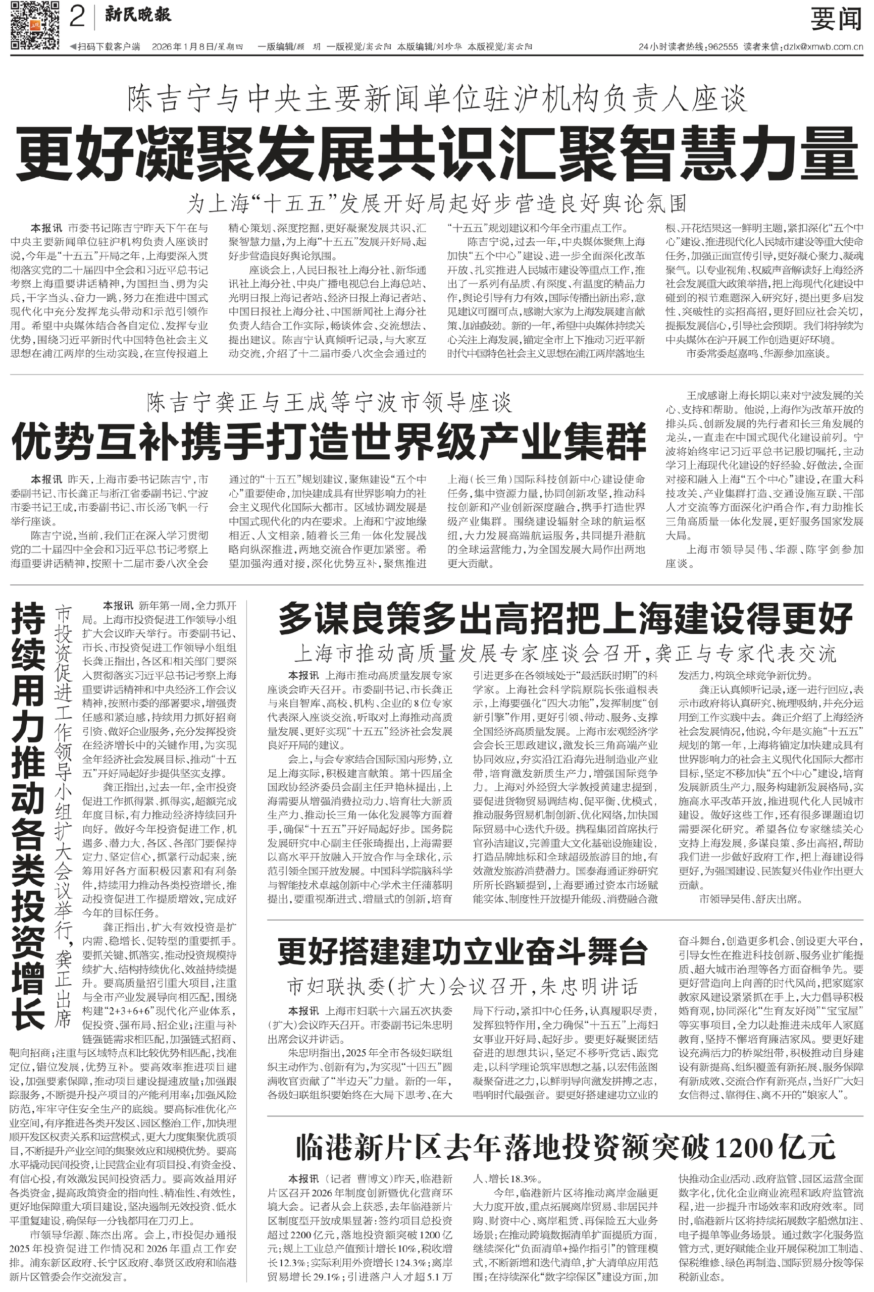 本报讯 市委书记陈吉宁昨天下午在与中央主要新闻单位驻沪机构负责人座谈时说,今年是“十五五”开局之年,上海要深入贯彻落实党的二十届四中全会和习近平总书记考察上海重要讲话精神,为国担当、勇为尖兵,干字当头、奋力一跳,努力在推进中国式现代化中充分发挥龙头带动和示范引领作用。希望中央媒体结合各自定位、发挥专业优势,围绕习近平新时代中国特色社会主义思想在浦江两岸的生动实践,在宣传报道上精心策划、深度挖掘,更好凝聚发展共识、汇聚智慧力量,为上海“十五五”发展开好局、起好步营造良好舆论氛围。