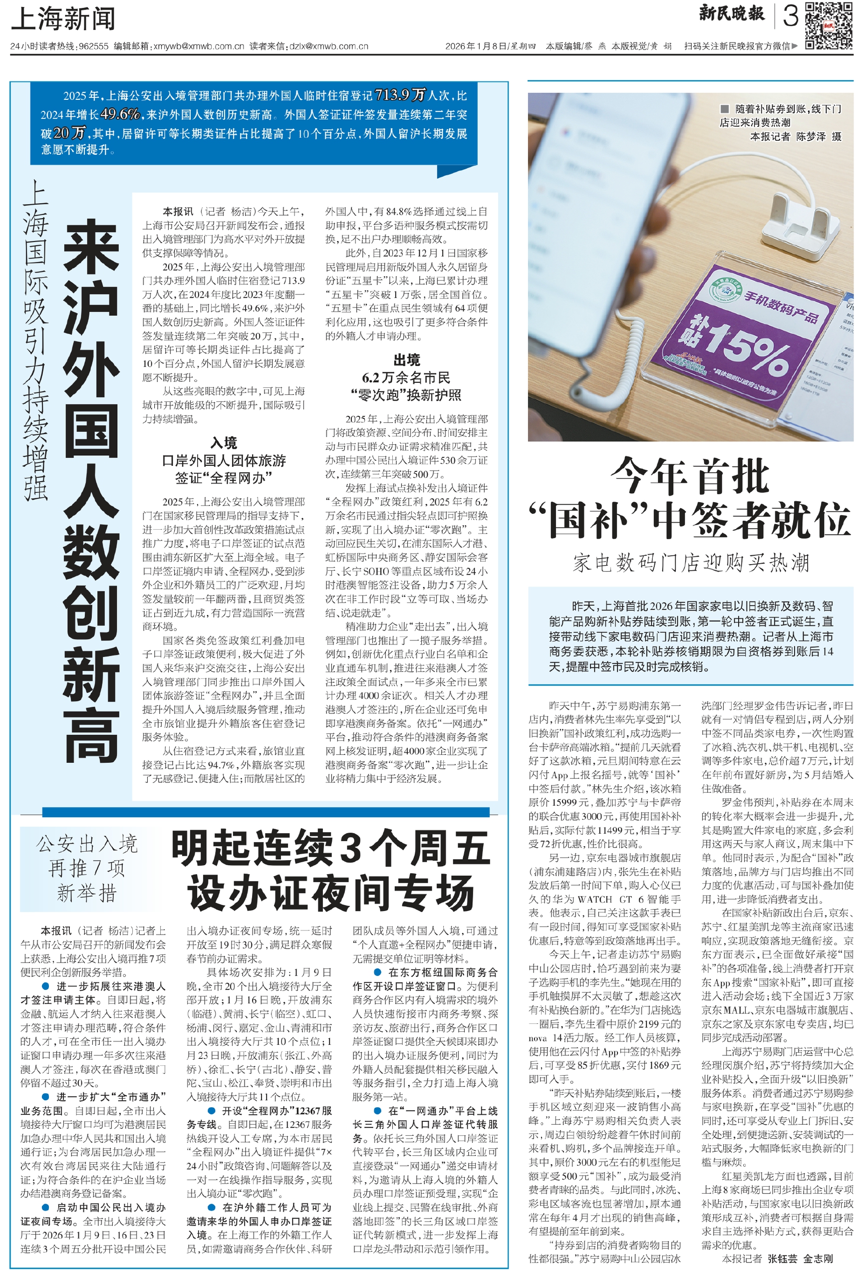 2025年,上海公安出入境管理部门将政策资源、空间分布、时间安排主动与市民群众办证需求精准匹配,共办理中国公民出入境证件530余万证次,连续第三年突破500万。