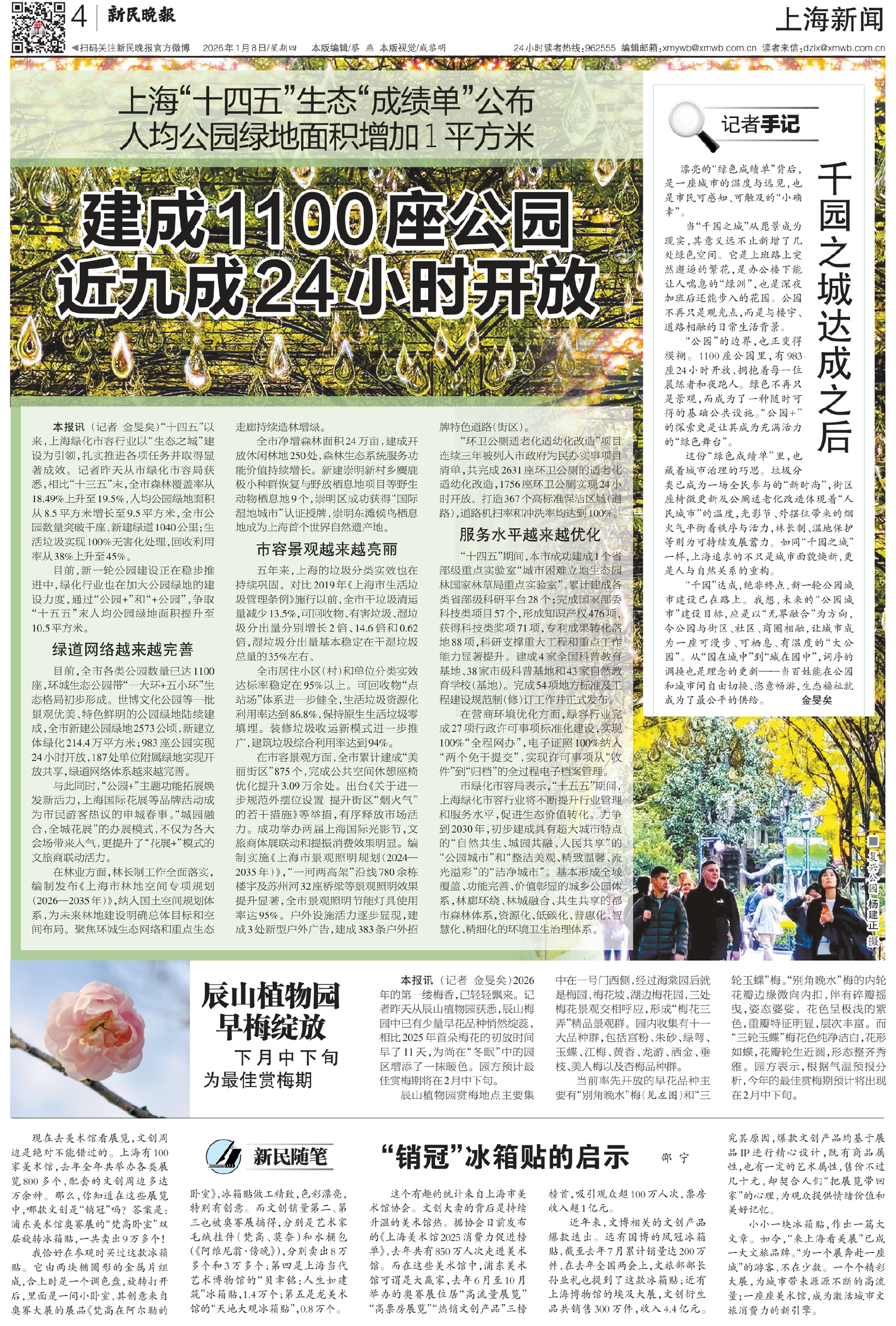 市绿化市容局表示,“十五五”期间,上海绿化市容行业将不断提升行业管理和服务水平,促进生态价值转化。力争到2030年,初步建成具有超大城市特点的“自然共生、城园共融、人民共享”的“公园城市”和“整洁美观、精致温馨、流光溢彩”的“洁净城市”。基本形成全域覆盖、功能完善、价值彰显的城乡公园体系,林廊环绕、林城融合、共生共享的都市森林体系,资源化、低碳化、普惠化、智慧化、精细化的环境卫生治理体系。