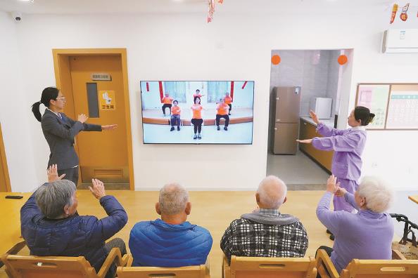 今天早上,真康敬老院工作人员带领老人做健康操