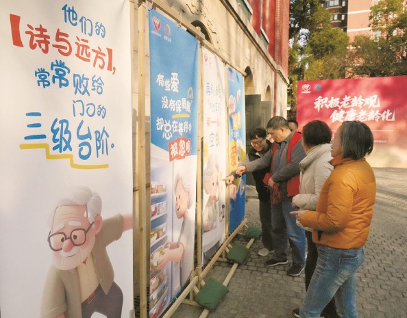 如何通过“老年创新街区”的建立,在15分钟生活圈内,激活老年人的社会参与、知识传承与经济活力?昨天,市老年基金会在华东政法大学举办“积极老龄观,健康老龄化”主题座谈会,专家学者为积极应对人口老龄化、推动老龄事业与银发产业高质量发展建言献策。图为市民在论坛海报前驻足观看 本报记者 张龙 摄影报道
