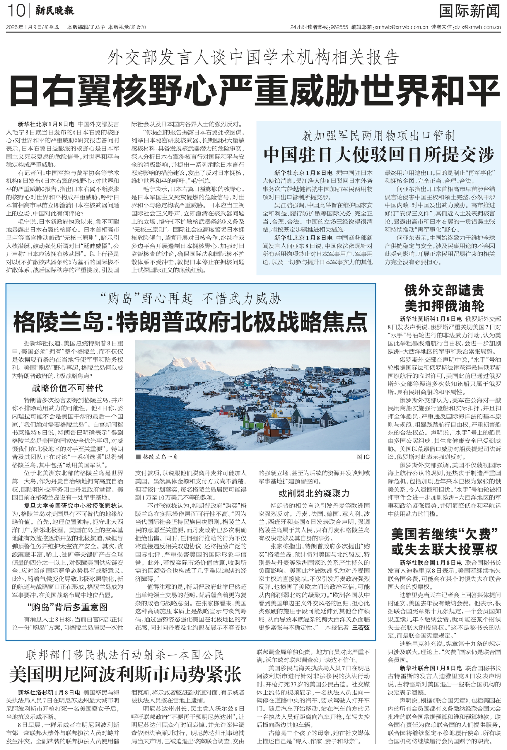 新华社北京1月8日电 中国外交部发言人毛宁8日就当日发布的《日本右翼的核野心:对世界和平的严重威胁》研究报告答问时表示,日本右翼日益膨胀的核野心是日本军国主义死灰复燃的危险信号,对世界和平与稳定构成严重威胁。