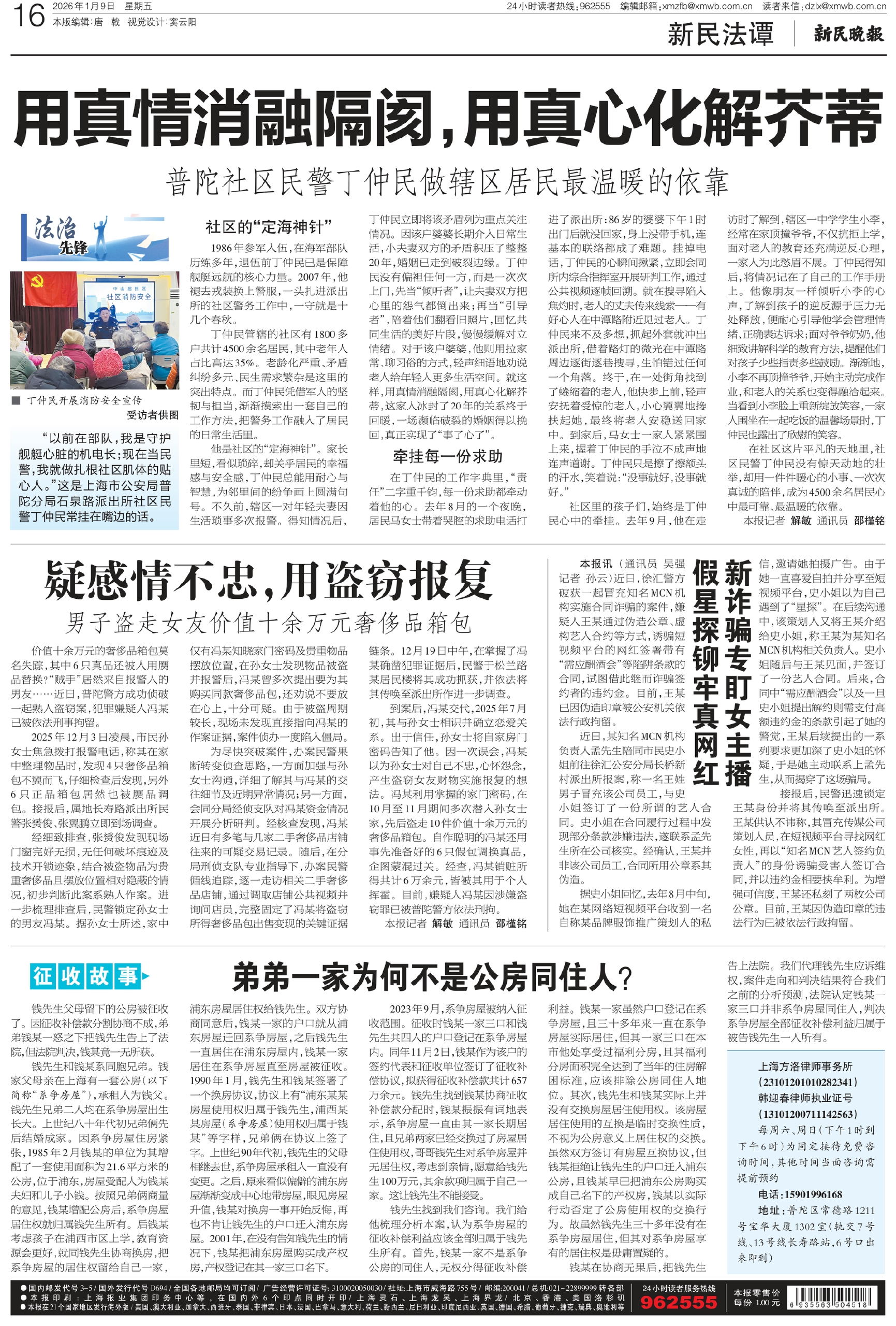 “以前在部队,我是守护舰艇心脏的机电长;现在当民警,我就做扎根社区肌体的贴心人。”这是上海市公安局普陀分局石泉路派出所社区民警丁仲民常挂在嘴边的话。