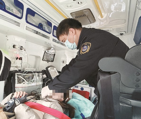 担架抬上车,周锦迅速为女子贴上电极片,同步测血压、血氧饱和度。很快,检查结果出来了:“心电图、血压、氧饱和度均正常。”他观察女子的状态问:“是不是感觉好多了?”