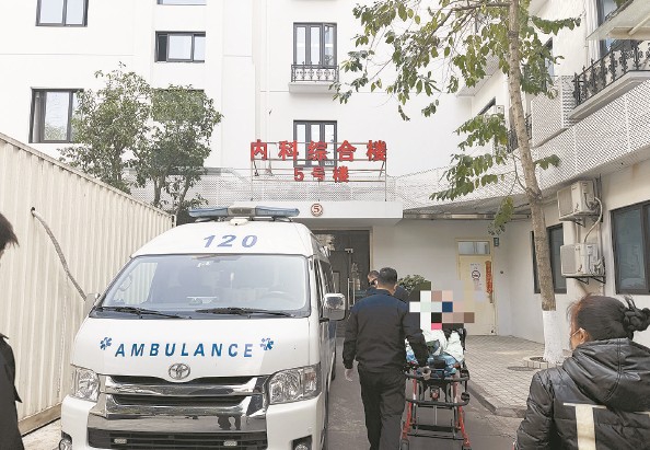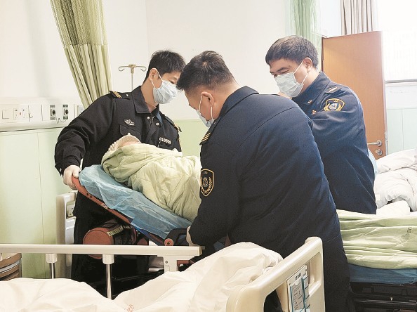 周锦所在车组抵达病房时,老人还静卧病床。家属说道:“你们稍等,外面冷,我给老人换身衣服。”经过15分钟的等待,家属收拾好行李,为老人换上便装。急救人员合力将老人小心抬抱上担架床,推出病房,却在电梯口遇上高峰时段,等候片刻才将担架床“挤进”电梯,终于顺利送上救护车。
