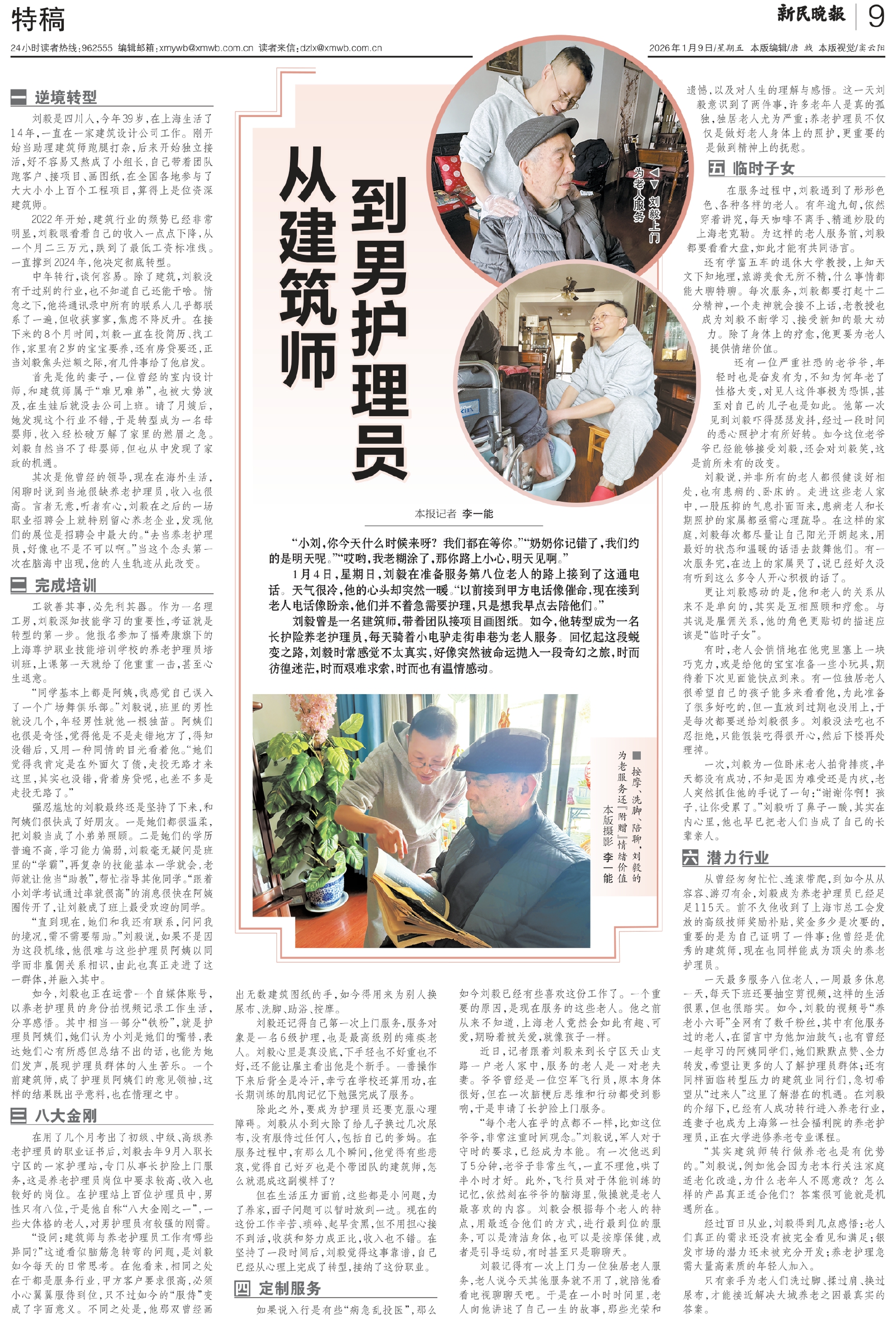 “设问:建筑师与养老护理员工作有哪些异同?”这道看似脑筋急转弯的问题,是刘毅如今每天的日常思考。在他看来,相同之处在于都是服务行业,甲方客户要求很高,必须小心翼翼服侍到位,只不过如今的“服侍”变成了字面意义。不同之处是,他那双曾经画出无数建筑图纸的手,如今得用来为别人换尿布、洗脚、助浴、按摩。