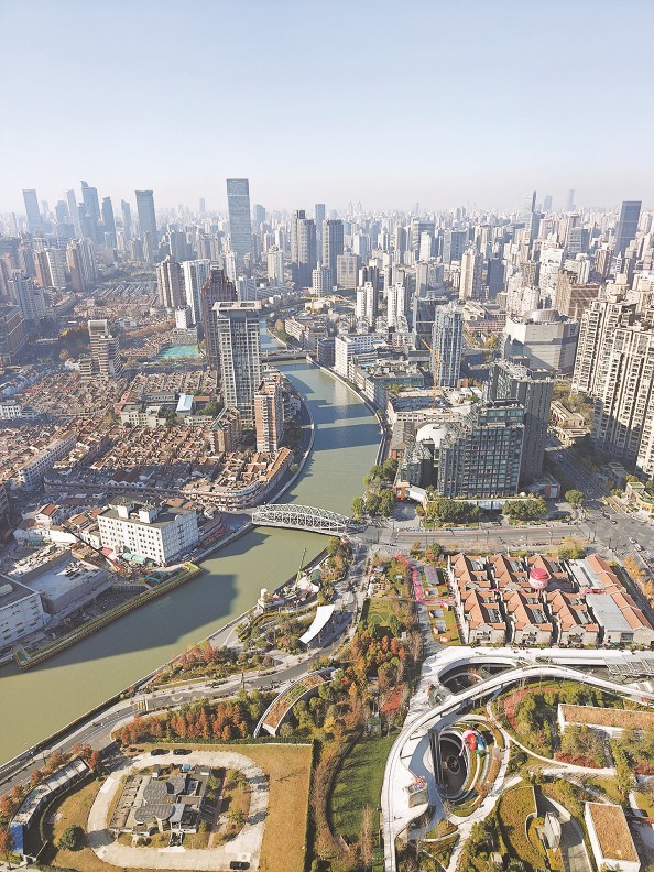 从苏河湾中心俯瞰苏州河滨河空间 本报记者 刘歆 摄