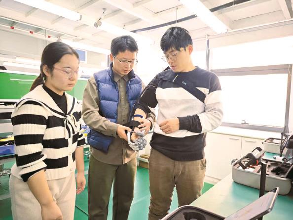 在位于普陀桃浦的上海海每康智能医疗科技有限公司研发基地,记者看到,这款手部外骨骼设备尺寸与普通手套相近,患者穿戴弹力辅助装置后即可使用(见上图 受访者供图)。其核心的神经接口驱动模块由企业自主研发,通过固定在小臂上的采集装置,可精准捕捉使用者的肌电信号。