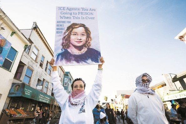 新华社上午电 “不要ICE!不要三K党!不要法西斯美国!”在美国加利福尼亚州南部城市帕萨迪纳,超过500名抗议者10日高喊口号、手举标语,聚集在市政厅附近一主要路口,经过的车辆纷纷鸣笛对抗议表示支持。