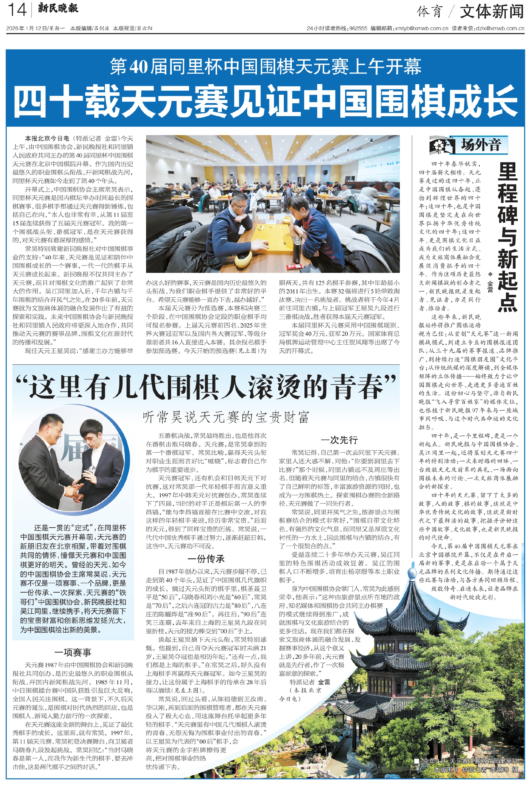 本报北京今日电(特派记者 金雷)今天上午,由中国围棋协会、新民晚报社和同里镇人民政府共同主办的第40届同里杯中国围棋天元赛在北京中国棋院开幕。作为国内历史最悠久的职业围棋头衔战,开新闻棋战先河,同里杯天元赛如今走到了第40个年头。