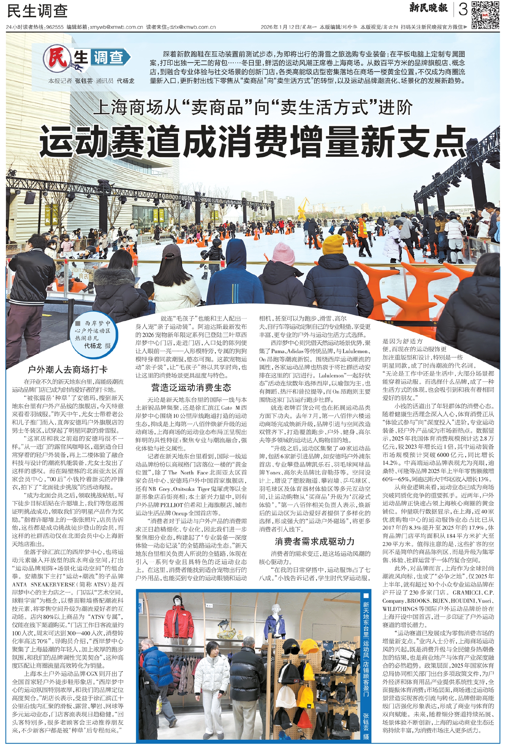 踩着新款跑鞋在互动装置前测试步态,为即将出行的滑雪之旅选购专业装备;在平板电脑上定制专属图案,打印出独一无二的背包……冬日里,鲜活的运动风潮正席卷上海商场。从数百平方米的品牌旗舰店、概念店,到融合专业体验与社交场景的创新门店,各类高能级店型密集落地在商场一楼黄金位置,不仅成为商圈流量新入口,更折射出线下零售从“卖商品”向“卖生活方式”的转型,以及运动品牌潮流化、场景化的发展新趋势。