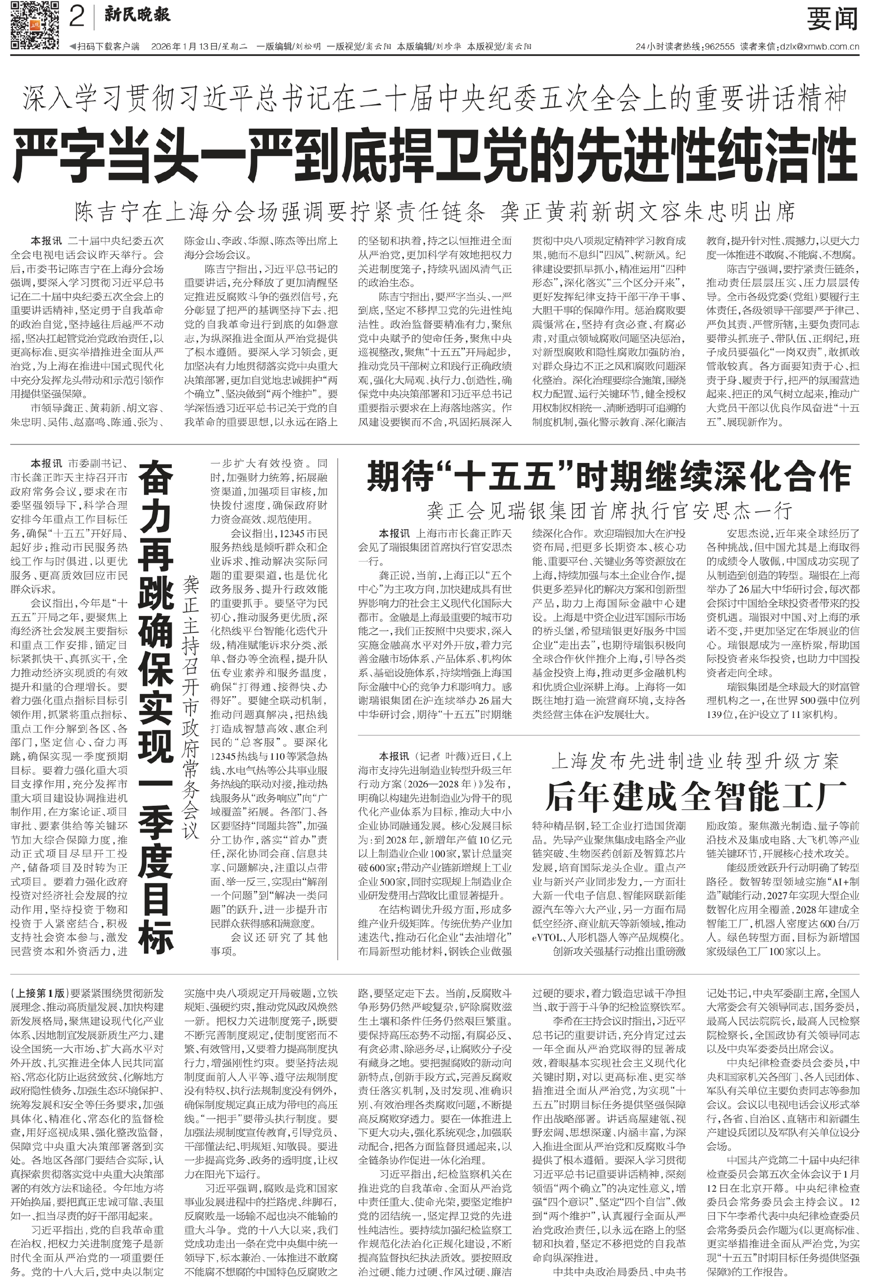 陈吉宁指出,要严字当头、一严到底,坚定不移捍卫党的先进性纯洁性。政治监督要精准有力,聚焦党中央赋予的使命任务,聚焦中央巡视整改,聚焦“十五五”开局起步,推动党员干部树立和践行正确政绩观,强化大局观、执行力、创造性,确保党中央决策部署和习近平总书记重要指示要求在上海落地落实。作风建设要锲而不舍,巩固拓展深入贯彻中央八项规定精神学习教育成果,驰而不息纠“四风”、树新风。纪律建设要抓早抓小,精准运用“四种形态”,深化落实“三个区分开来”,更好发挥纪律支持干部干净干事、大胆干事的保障作用。惩治腐败要震慑常在,坚持有贪必查、有腐必肃,对重点领域腐败问题坚决惩治,对新型腐败和隐性腐败加强防治,对群众身边不正之风和腐败问题深化整治。深化治理要综合施策,围绕权力配置、运行关键环节,健全授权用权制权相统一、清晰透明可追溯的制度机制,强化警示教育、深化廉洁教育,提升针对性、震撼力,以更大力度一体推进不敢腐、不能腐、不想腐。