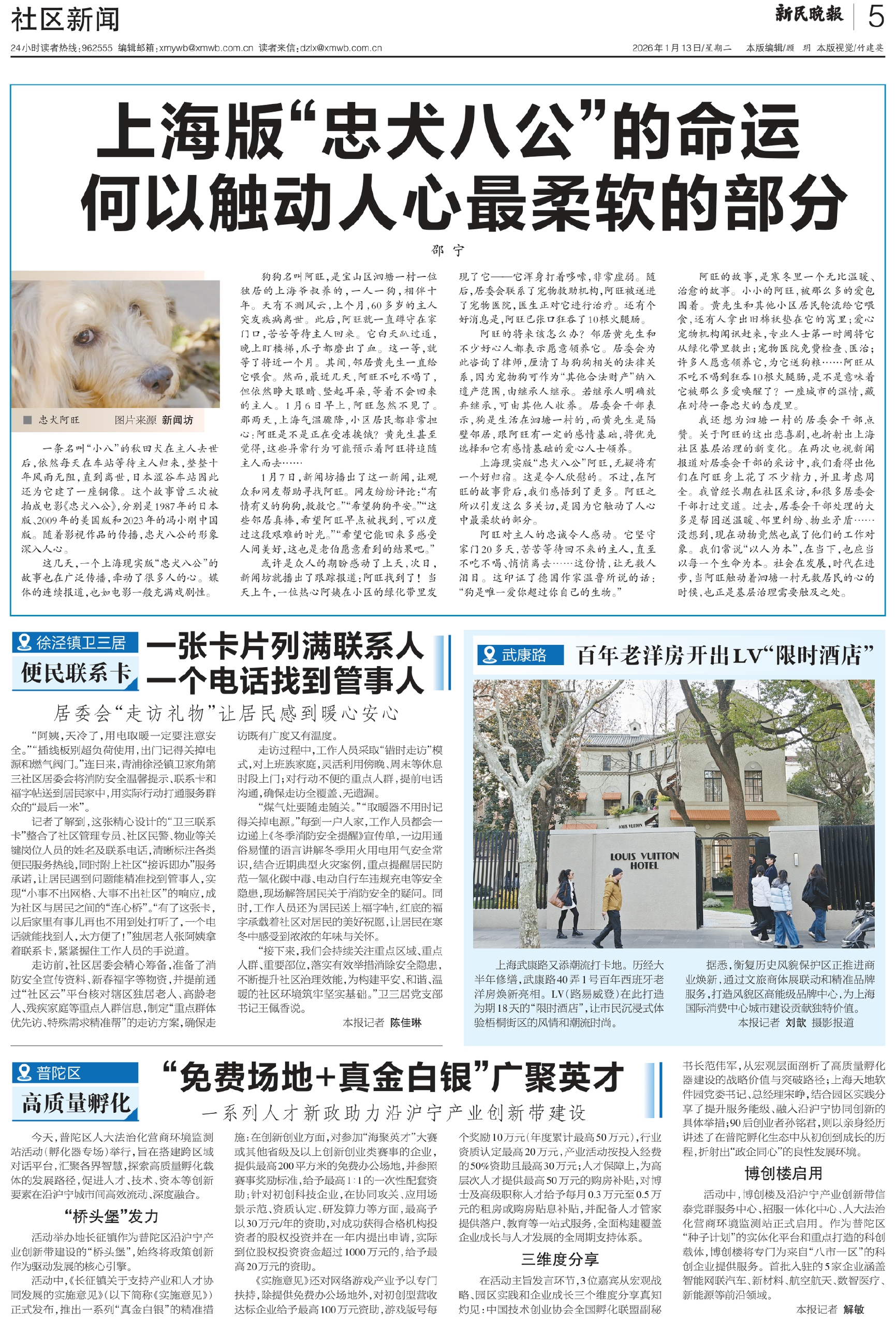我还想为泗塘一村的居委会干部点赞。关于阿旺的这出悲喜剧,也折射出上海社区基层治理的新变化。在两次电视新闻报道对居委会干部的采访中,我们看得出他们在阿旺身上花了不少精力,并且考虑周全。我曾经长期在社区采访,和很多居委会干部打过交道。过去,居委会干部处理的大多是帮困送温暖、邻里纠纷、物业矛盾……没想到,现在动物竟然也成了他们的工作对象。我们常说“以人为本”,在当下,也应当以每一个生命为本。社会在发展,时代在进步,当阿旺触动着泗塘一村无数居民的心的时候,也正是基层治理需要触及之处。
